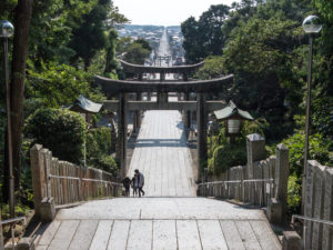 神社から海へとまっすぐに続く参道は、10月と2月の年に2回、その真正面に太陽が沈みます。