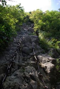 山頂への参道は、鎖の行場で名高い試しの鎖、一ノ鎖、ニノ鎖、三之鎖が掛けられています。