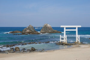 海の中にひっそりと建つ2つの岩は、夫婦和合、恋愛成就のパワースポットです。向かって右側の男岩は高さ11.8メートル、左側の女岩は高さ11.2メートルで、2つの岩は長さ30メートル、直径50センチの大注連繩で結ばれています。