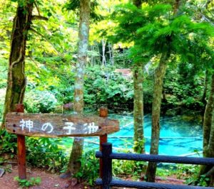 奇跡のコバルトブルーの池、神からの贈り物、神の作った池などと呼ばれ、先人達は、この御池を神様からの贈り物に違いないと思い、神の子池と呼ぶようになったそうです。