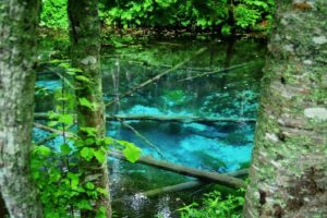 化石のような倒木とコバルトブルーの水色がとても神秘的で、パワースポットとしてだけではなく、景観のひとつとしても楽しむことができるのが、神の子池の魅力でもあります。
