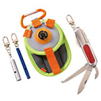 ポケットナイフには6種類の機能。手のひらサイズのポーチには温度計を装備。ホイッスル・LEDトーチもついています。
