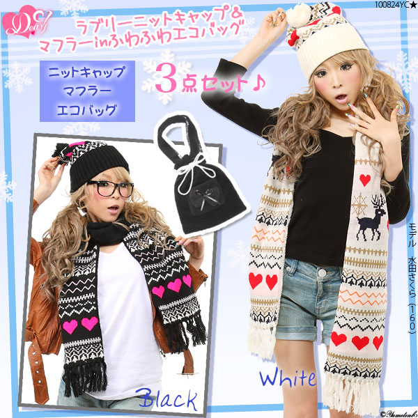 あったかCuteなハート柄のマフラー&ニットに、今話題のエコBAGがセットになりましたマフラーは首にぐるっと巻けるロング丈でトレンドさ◎ 裏地はボアになっててヌクヌク度満点!!大流行のジャガード柄ニットにはガーリーさをUPさせる可愛いポンポン付きこの2アイテムをinできるバッグはフ ワフワで肌触りバツグン中のドット柄がオシャレでしょ買った瞬間お出かけ必須アイテムになることマチガイなしだね!!