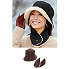 折りたためる耳あてが付いた帽子。ツバの部分と耳あてにシープ調のボア素材を使用。お揃いのマフラーも付いているので、可愛く、あったかく、コーディネートできます。