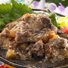骨付き豚バラ肉(スペアリブ)の軟骨の部分の肉だけを選んで圧力釜でしっかりと軟骨がトロットロになるまで煮込むことで、軟骨まで柔らかくそのまま食べられたっぷりのコラーゲンも取れちゃう!しかもおいしー!のがこの「軟骨ソーキ煮付け」です。